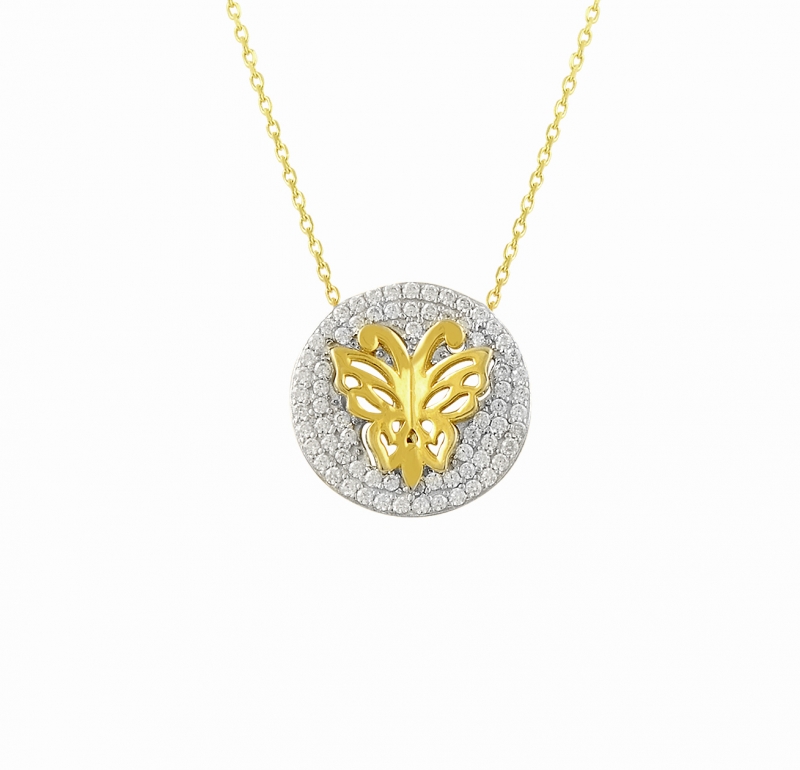 Beyaz Yuvarlak Üzerinde Kelebek Altın Kolye