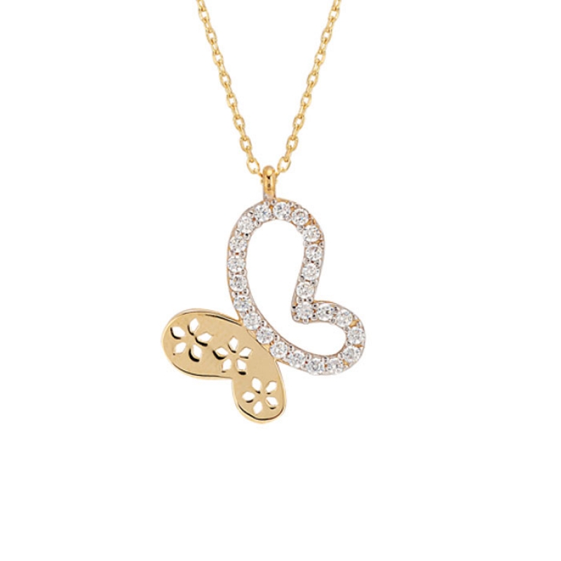 Kelebek İçinde Çiçek Motifli Altın Kolye
