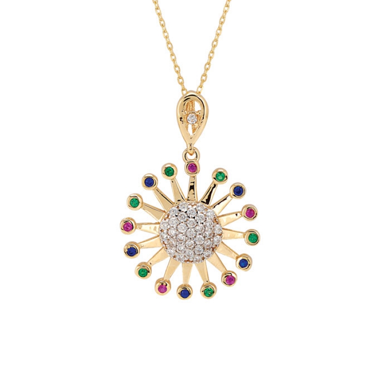 Güneş Motifli Renkli Taşlı Altın Kolye
