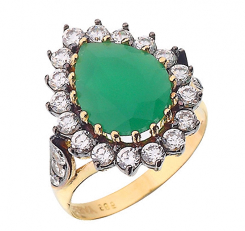 Büyük Yeşil Damla Taşlı Sarı Altın Yüzük